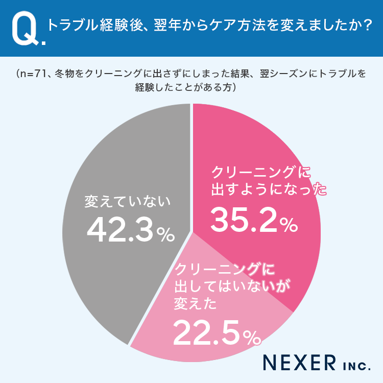 その結果「クリーニングに出すようになった」が35.2%、「クリーニングに出してはいないが変えた」が22.5%、「変えていない」が42.3%という結果になりました。