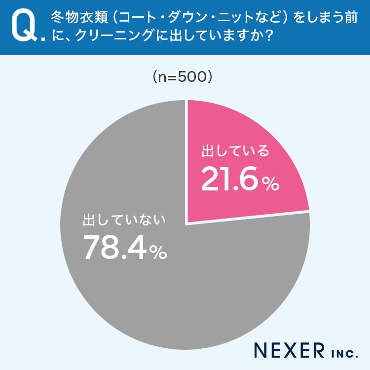 その結果「出している」と回答した人が21.6%、「出していない」と回答した人が78.4%でした。約8割の人が、冬物をクリーニングに出さずにしまっているということが明らかになりました。