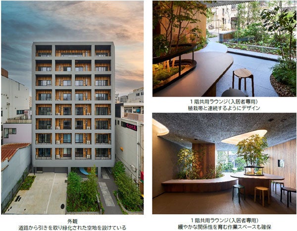 中低層建物が密集する都心の街区に建つ集合住宅。開口部や色彩の調整により、バルコニーが持つ生活感を和らげ、周辺環境のスケールと穏やかに調和する外観を形成しました。都市生活者が求める、他者の存在を感じられる緩やかな関係性を育む入居者が自由に利用できる共用ラウンジと、周辺住民にも憩いの場となる前面の緑化空間は、都市に共生の風景をもたらしています。