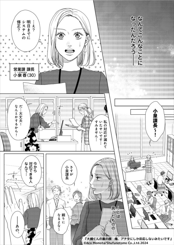 小泉 香(こいずみ かおる)(30)は、美人で課長としての人望も厚く、会社では高嶺の花的な存在。しかし元カレに「不感症」のレッテルを張られたことがトラウマとなり、恋愛には奥手になってしまっていた。