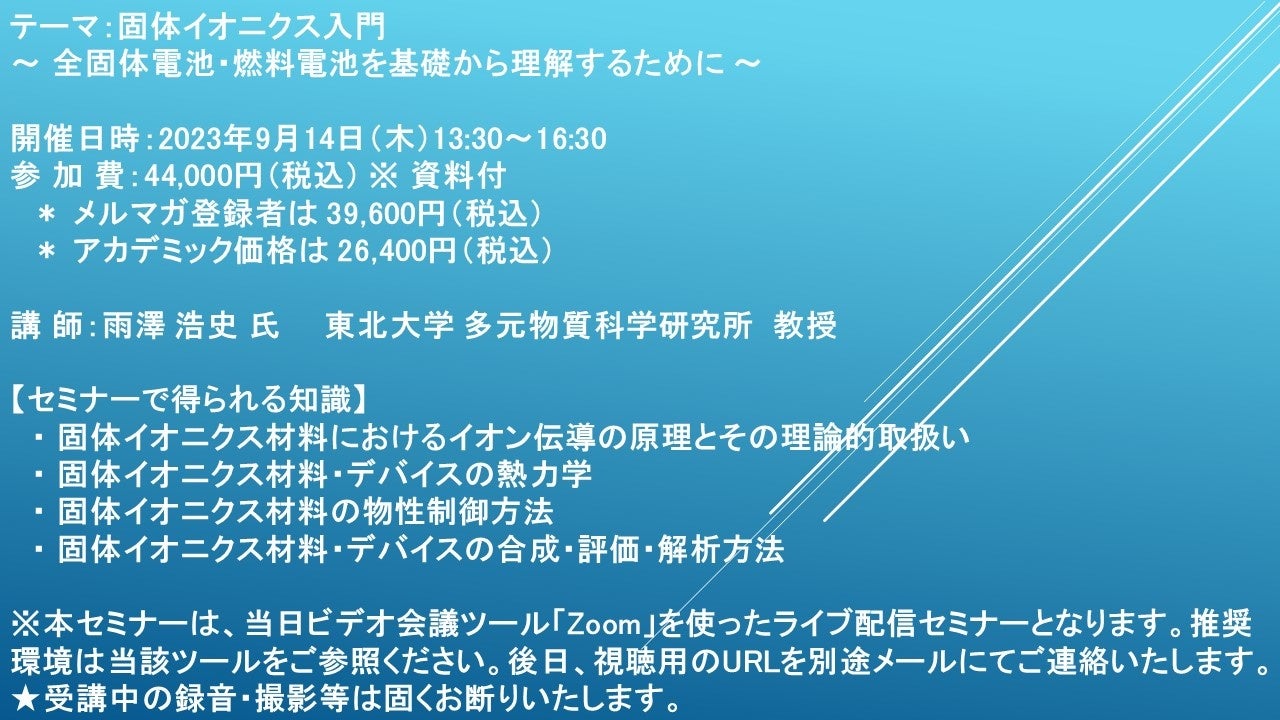 【ライブ配信セミナー】固体イオニクス入門~ 全固体電池・燃料電池を基礎から理解するために ~ 9月14日(木)開催 主催:(株)シーエムシー・リサーチ