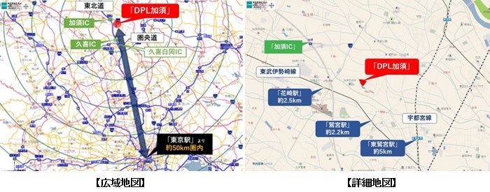 このたび着工した「DPL加須」は、東京都心より約50km圏内に位置し、東北自動車道および首都圏中央連絡道路自動車道(圏央道)へのアクセスが容易な場所に立地。埼玉エリアはもとより、東京都心エリア、東北地方への中継物流としての配送拠点として最適な場所で、高速道路の利便性も活かせる広域配送に適した立地です。