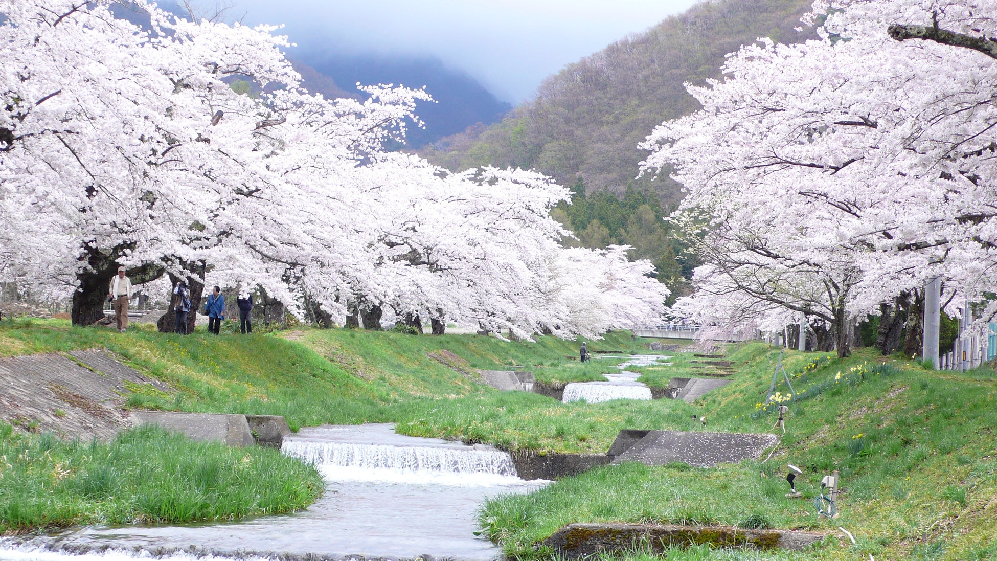 【4 月下旬〜5 月上旬】両川岸に 1km 続く“観音寺川の桜並木”&磐梯山と桜(猪苗代町・ホテルより車で約 40 分)