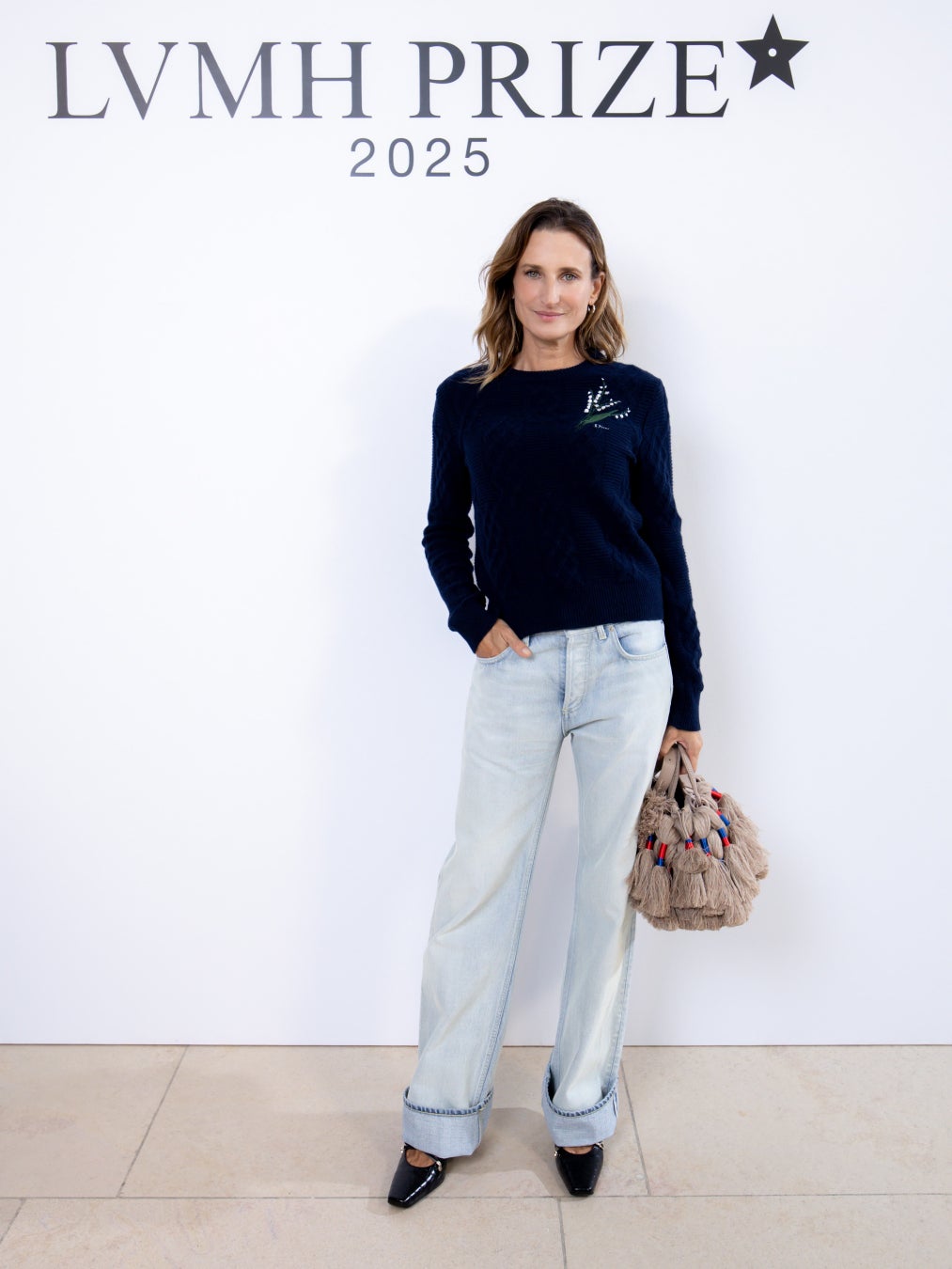 カミーユ・コッタンはネイビーブルーのウールセーターとライトブルーのコットンパンツに、ディオールのバッグとシューズを合わせました。