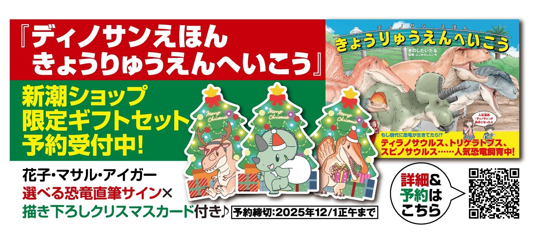 本セットは、ティラノサウルス/トリケラトプス/ステゴサウルスの3種類から選べる、描き下ろし恐竜クリスマスカードと直筆サイン入り絵本の限定セットです。