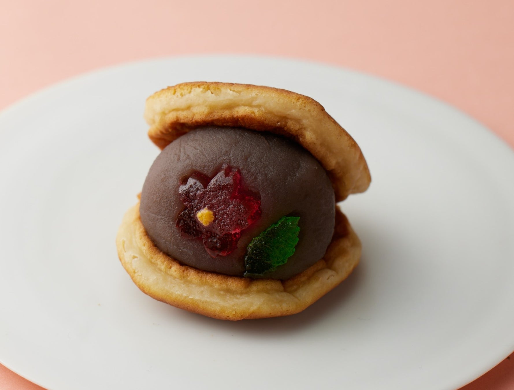 桜の葉を練り込んだ餡と桜型のゼリーが入った春らしいどら焼きです。