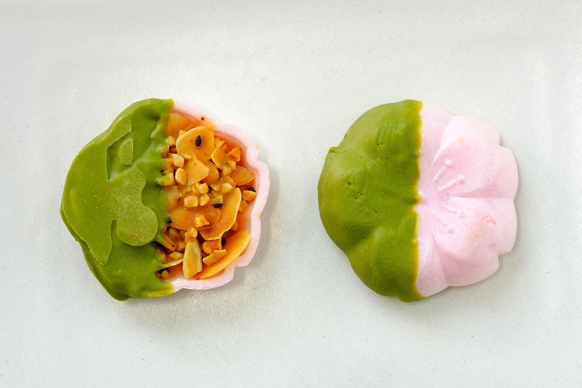 桜の花を模した最中に広島県産の藻塩でまろやかなアクセントを添えたフロランタン。抹茶チョコレートをかけた春のスイーツです。