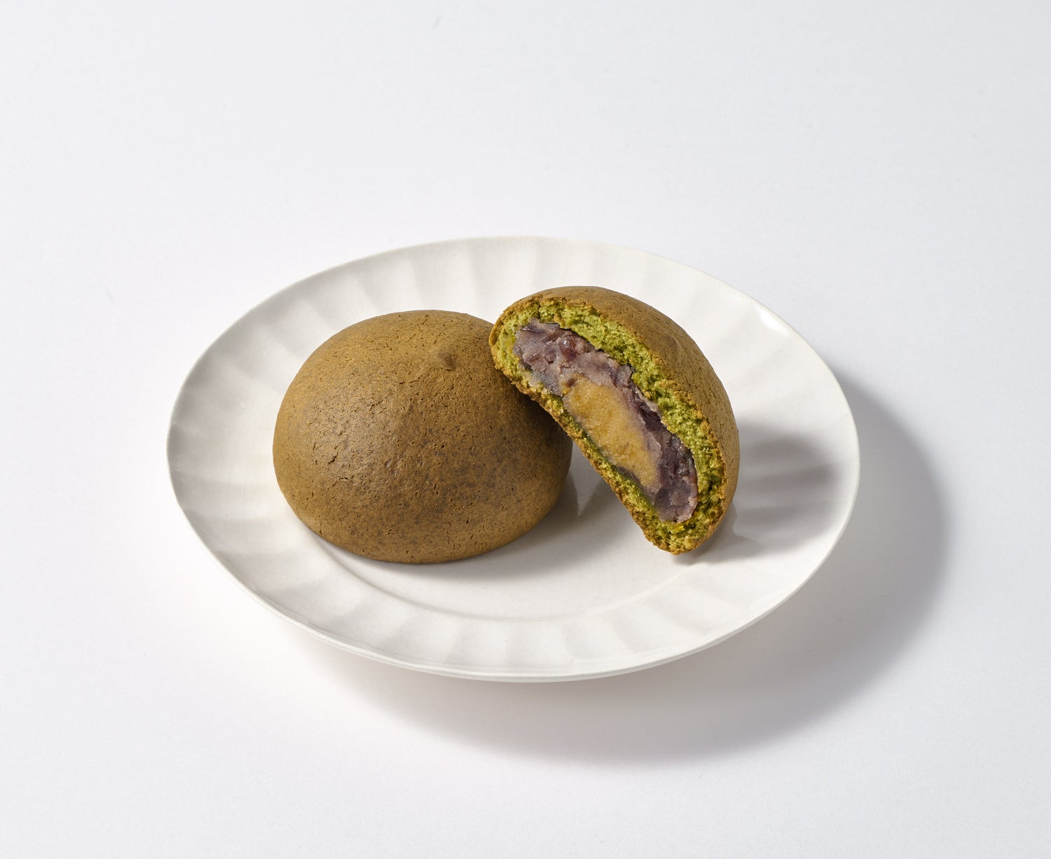 宇治抹茶入りのパンで粒餡と栗きんとん餡を包みました。