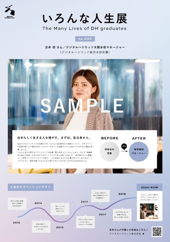 また、パネルはイベント後もSTUDIO校舎に常設いたしますので日々ご来校いただくデジタルハリウッドSTUDIOの受講検討者の皆さまにも、卒業生がどのようなステップでキャリアチェンジを成功させたのかご覧いただくことで具体的に受講イメージを膨らませ、新たな挑戦に対する不安を少しでも払拭できれば幸いです。