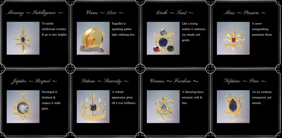 木星 ~尊敬~ 慈しみと敬いを纏い 気高くも優しい | 土星 ~誠実~ 精練された姿から 偽りなき輝きを放つ | 天王星 ~自由~ 普くものを解放せんとする 奔放さにかしづく | 海王星 ~純粋~ 限りなく透明で 氷のような滑らかさを持つ |