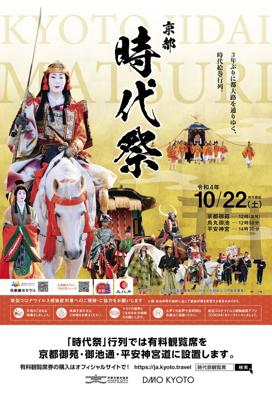 | 『時代祭』 チケット発売中 Pコード:648-747 ▼10月22日(土) 京都御苑/御池通/平安神宮道 一般席(京都御苑)-3500円(パンフレット・手提げ袋付) 一般席(御池通)-3500円(パンフレット・手提げ袋付) 一般席(平安神宮道)-3500円(パンフレット・手提げ袋付) まなび席(御池通)-7500円(専用ガイドのイヤホン解説・パンフレット・手提げ袋付) 【京都御苑会場】受付開始10:30/先頭通過時刻12:00頃。 【御池通会場】受付開始11:30/先頭通過時刻12:50頃。 【平安神宮道会場】受付開始13:00/先頭通過時刻14:20頃。 先頭通過予定時刻の30分前までにご入場下さい。混雑が予想されますので、お席にたどりつけない場合もあります。払い戻しはできませんので、余裕を持ってお越し下さい。【メールでのお問い合わせ先】jidai@pia.co.jp ※小児は膝上無料、お席が必要な場合有料。雨天の場合は10/23(日)に順延(当日早朝判断)。順延日も雨天の場合中止。牛馬暴走の可能性がある為フラッシュ撮影及び、ペット入場不可。新型コロナの影響により、内容変更又は中止の可能性あり。新型コロナ接触確認アプリ「COCOA」をインストールして下さい。時代祭行列が行われなかった場合を除き、一切料金の払戻はなし。体調不良、又は37.5度以上の熱がある場合は来場・観覧をご遠慮下さい。ご入場前に受付で手指の消毒をお願いします。観覧席エリア内では会話時のマスク着用をお願いします。注意事項等詳細は京都観光オフィシャルサイト京都観光Navi「時代祭」ページ( https://ja.kyoto.travel/event/major/jidai/seat.php )を必ずご確認の上ご来場下さい。 ※1人6枚まで。 ★チケットのご購入はこちら https://t.pia.jp/pia/event/event.do?eventCd=2228433 |