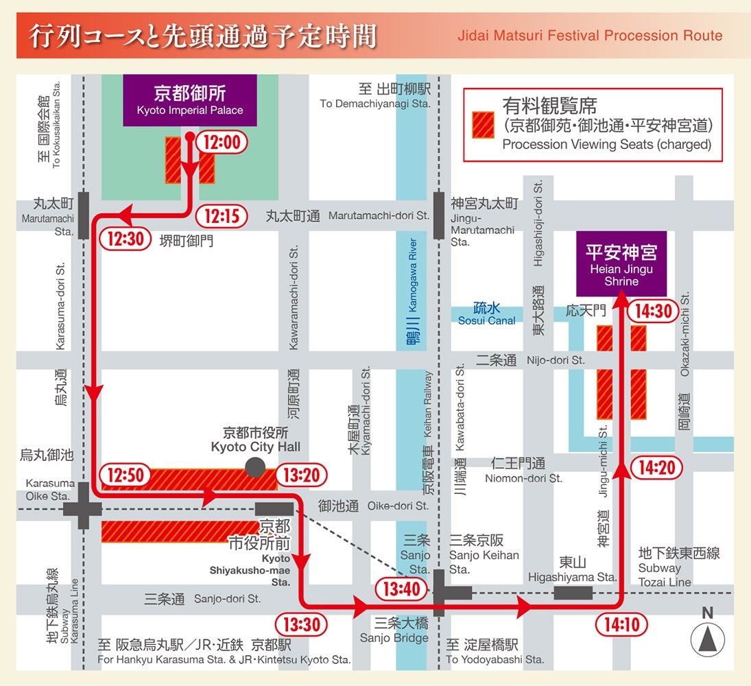 この行列をゆっくりと楽しむことができる有料観覧席が、京都御苑、御池通、平安神宮道に設置される。「行列が間近で見られる」「隣との距離が確保できて安心・安全」「ゆっくりと座って鑑賞できる」「伝統行事の保存・継承に役立てられる」というメリットに加え、「時代祭パンフレット」と「オリジナル手提げ袋」が付いてくる。また、チケットぴあのみで販売されているまなび席は、京都観光に精通する株式会社らくたびの講師によるイヤホン生解説付き。