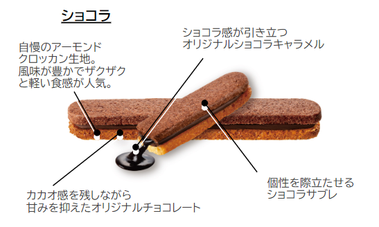 ベルギー産のキャラメルチョコレートにクッキーをフレーク状にして合わせ、アーモンドダイスと共に薄く成形しました。様々な食感のハーモニーが楽しいダックワーズサンドです。