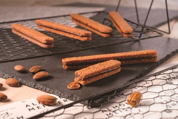 ふんわりと香ばしく焼き上げたダックワーズでアーモンドミルククリームとアーモンドキャラメルクランチをサンドした、新食感の「アーモンドウィッチサンド」です。