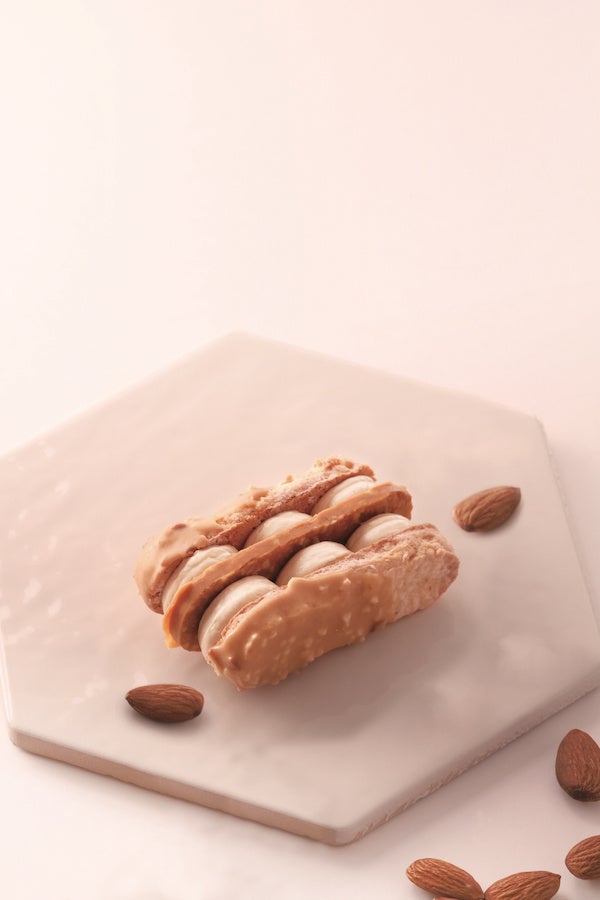 アーモンドクリームは無糖のアーモンドミルクをベースに、キャラメリゼしたアーモンドプラリネを加えて仕上げています。 間に挟むのはアーモンドキャラメルクランチ。