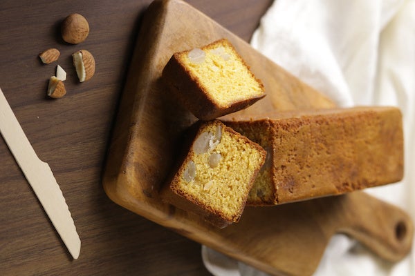 通常のパウンドケーキと異なり、生地にアーモンドを多く配合しており、相対的にグルテン量の少ない、しっとりとなめらかな生地に焼きあがっています。