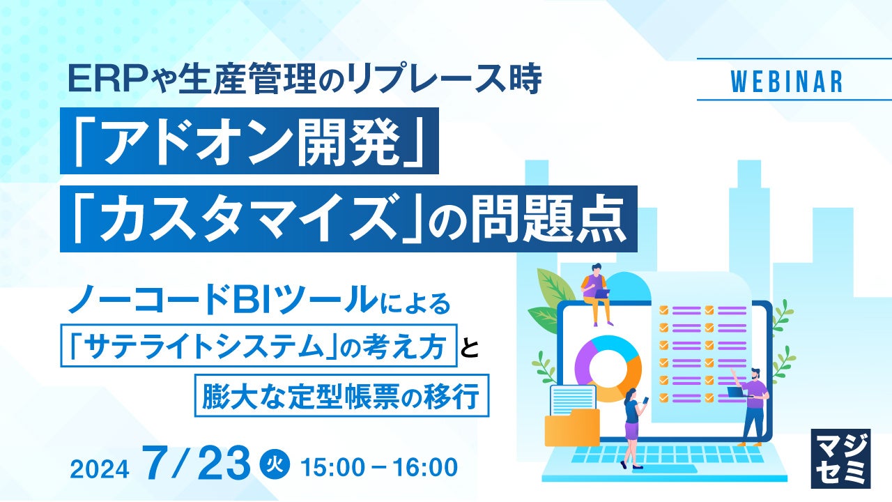 マジセミ株式会社は「ERPリプレース、アドオン開発の課題を、ノーコードBIで解決する」というテーマのウェビナーを開催します。