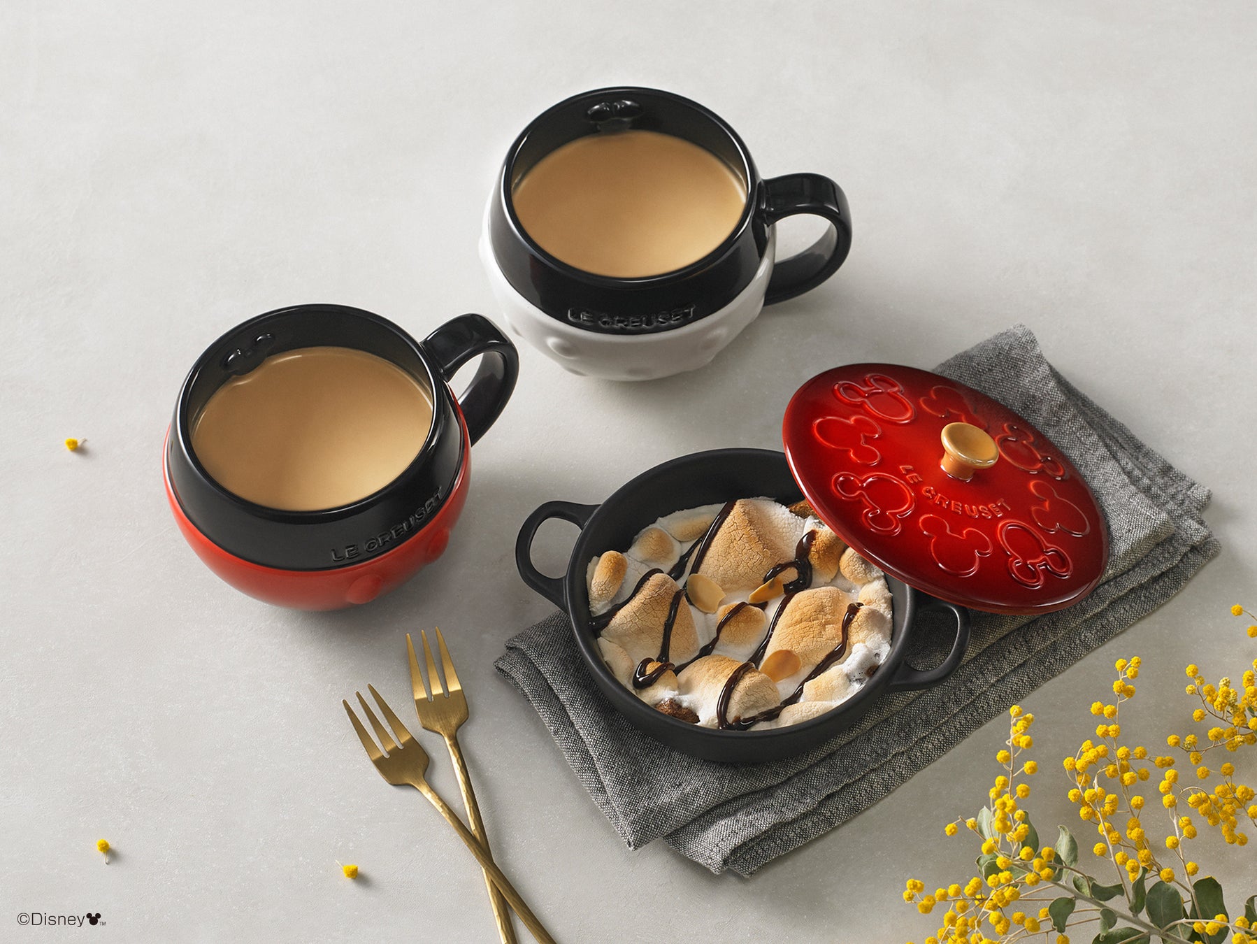 <ル・クルーゼ>左上:ミッキー&ミニー/マグ 2個セット 8,360円(ストーンウェア/容量:380㎖)、右下:ミッキーマウス/ミニ・マルミット 5,060円(ストーンウェア/直径(取手込)12.5(16)×高さ6cm(フタ込)/容量:約250㎖)