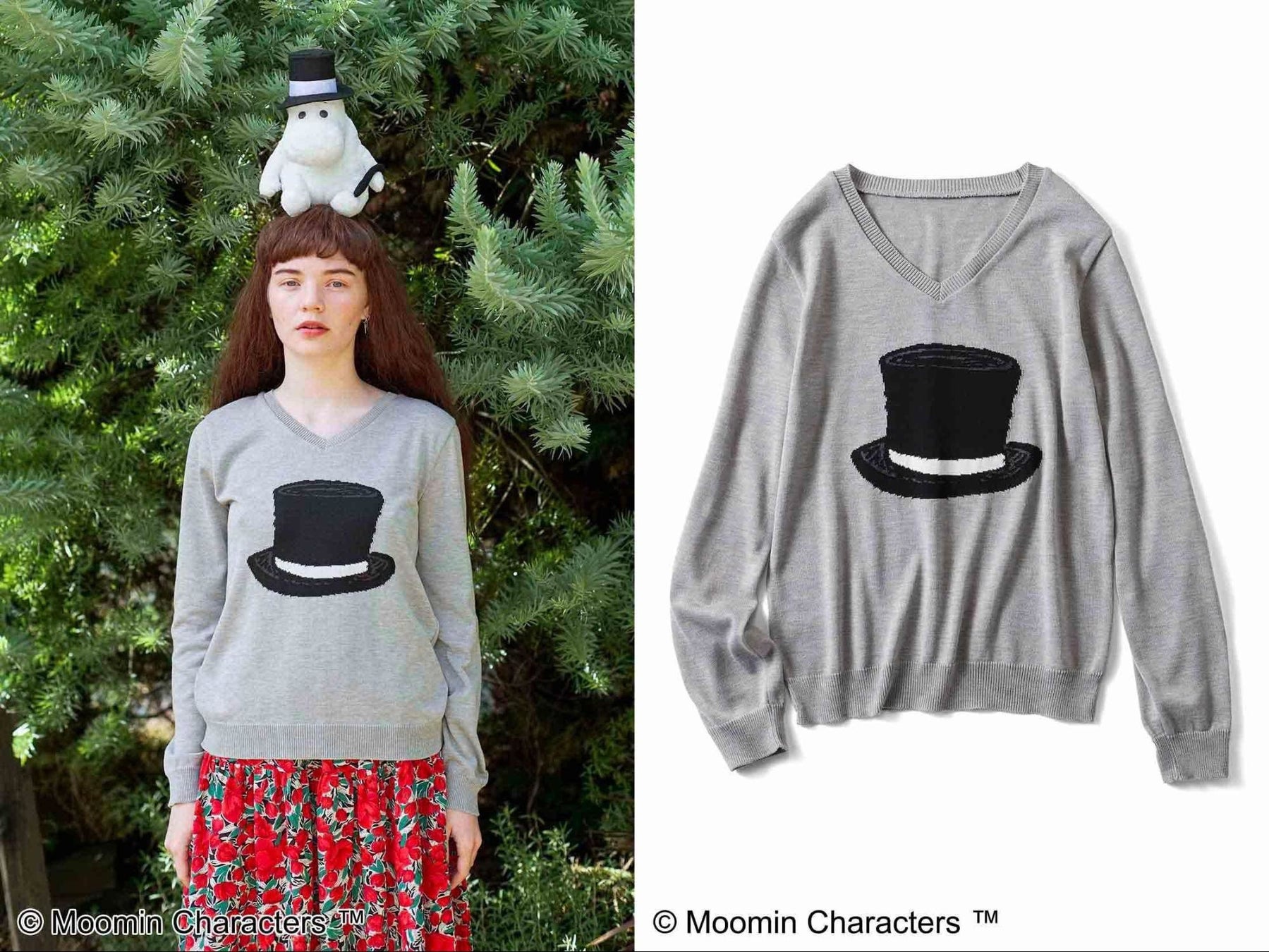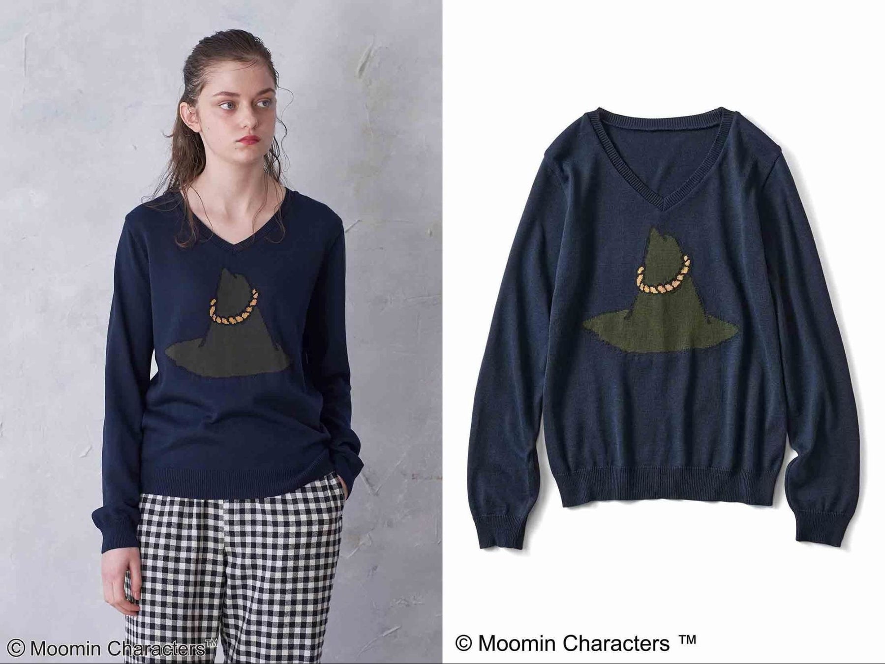 薄手のVネックニットの胸もとに、スナフキンとムーミンパパのトレードマークの帽子をインターシャジャカードという技法で編み上げた一着。キャラクターが登場しないので着こなしやすいデザインです。