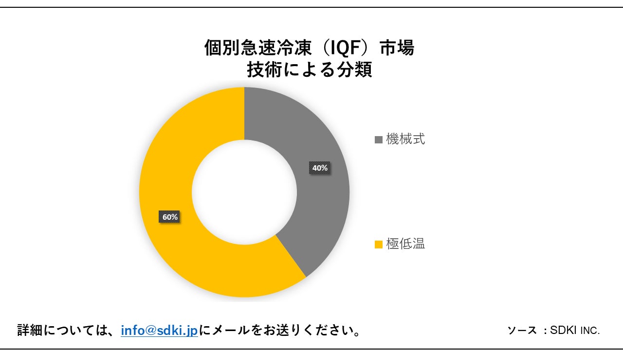 技術に基づいて、極低温 IQF 技術セグメントは、予測期間中に最高の市場成長率を持つと予想されますが、機械式 IQF 技術は最大の市場シェアを保持すると予想されます。機械式個別急速冷凍技術が装備された高度なシステムは、最小限のメンテナンス、供給の安全性、とエネルギー効率を保証します。冷媒の温度差で機械の冷却が遅くなると言われており、冷凍庫の設置面積が大きいことが欠点とされています。同容量の機械式冷却装置と比較すると、極低温IQF技術は初期投資が少なくて済むことが多いです。しかし、極低温技術は大量の冷媒を必要とするため、組織のエネルギー コストが上昇します。極低温蒸気は無味無臭であるため、生産設備で作業者を酸素置換から保護するためには、十分な換気が不可欠です。極低温冷凍は、個別の手羽先、冷凍エンドウ豆、その他の個別の急速冷凍 (IQF) 商品など、個々の部分を保存する必要があるバルク包装食品で最も頻繁に使用されます。