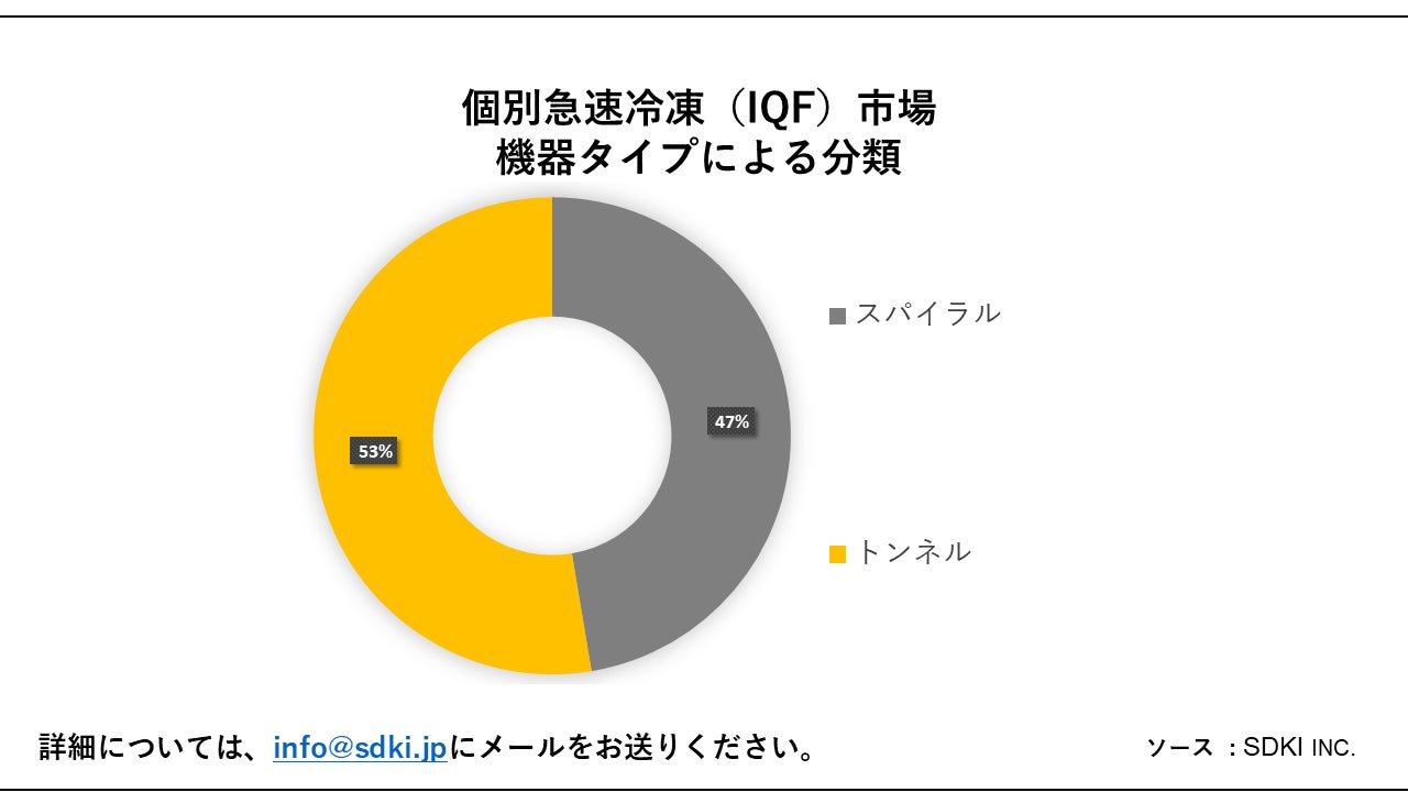 冷凍食品に対する需要の高まりが、個別急速冷凍(IQF)市場の成長を牽引する主な要因となっています。例えば、アメリカでは、2022年に冷凍食品の売上が8%以上増加しました。多忙なライフスタイルを送る人々の増加に伴い、冷凍食品など手軽に調理できる商品の需要が高まっています。冷凍食品の需要の高まりは、技術革新とIQF技術の開発を促すかもしれません。IQF装置の効率、能力、容量は、メーカーが冷凍方法の改善、自動化、省エネ技術など研究開発に投資することで向上する可能性があります。