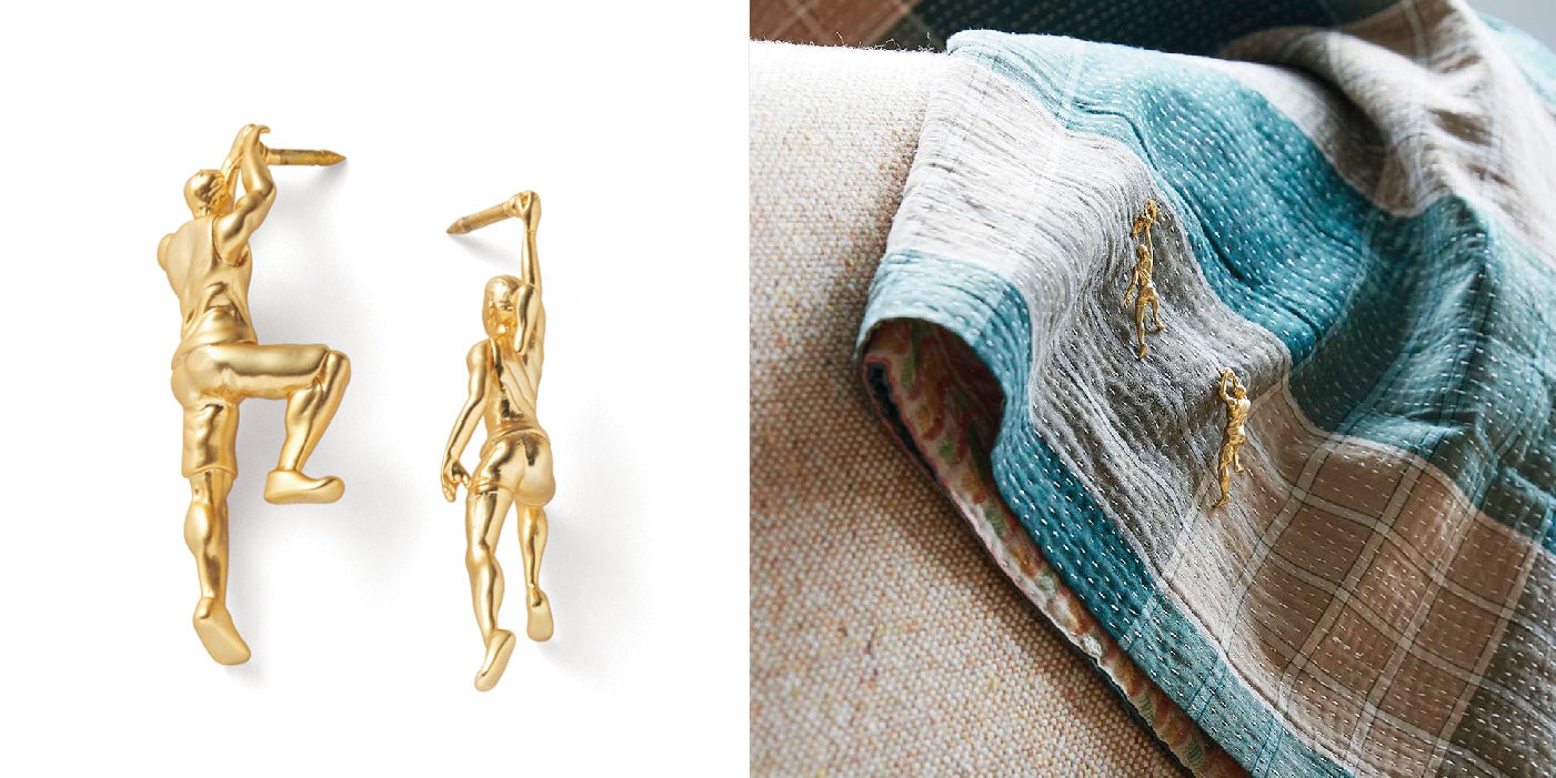 男女ペアでボルダリング中のピンバッジです。ボルダリングやクライミングは田中さんの作品のなかでもよく取り上げられている題材です。服やかばんや帽子などに取り付けてアクセントになるだけでなく、普段の生活のなかで『見立て』の楽しさを感じられるアクセサリーです。
