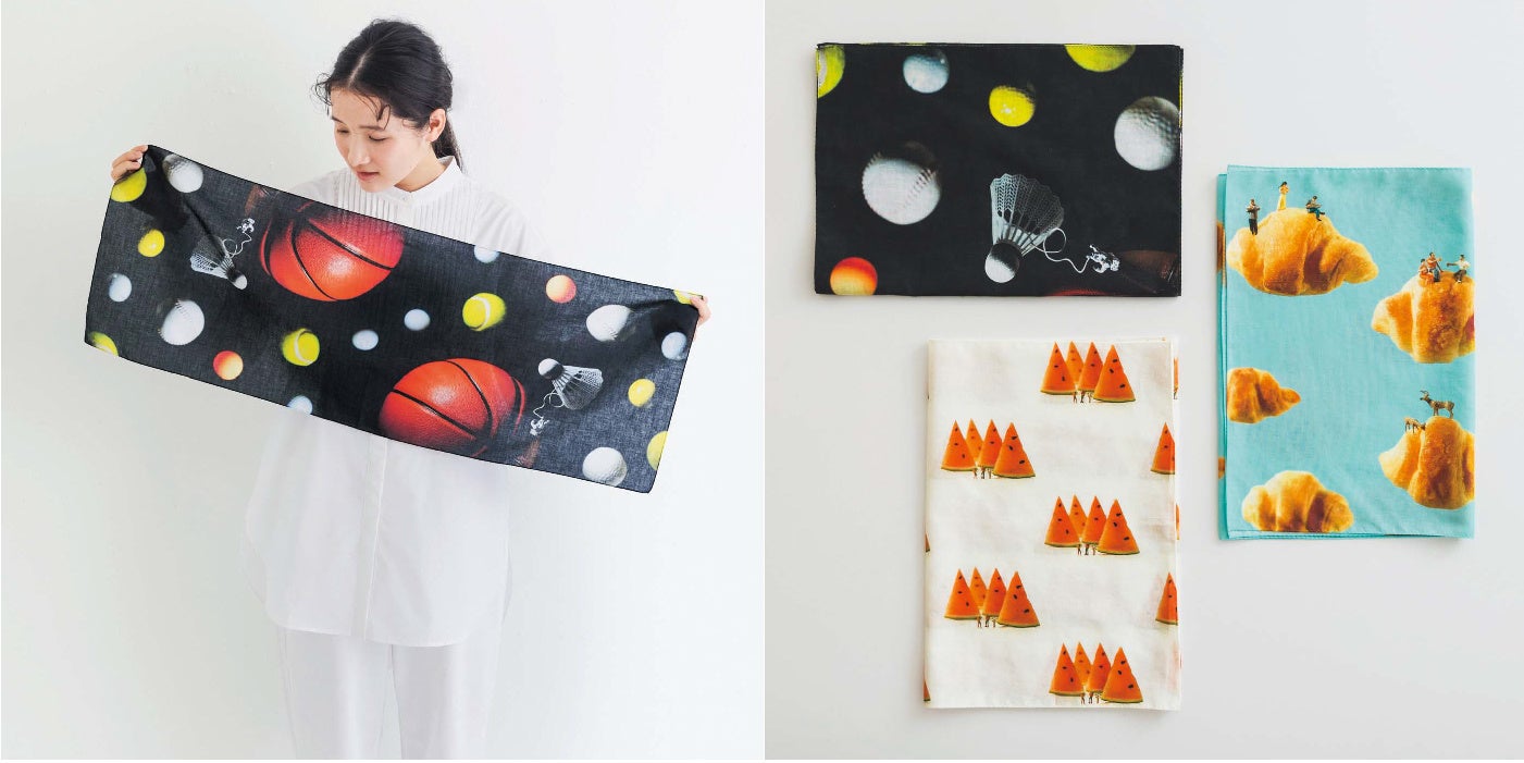 滑らかな肌ざわりの生地に、田中さんの作品をプリント。薄手でたたんでもかさばらず持ち歩きやすいので、ハンカチとしてや、バッグの中身の目隠しなどにも使えます。ディスプレイ感覚で飾ったり、ロングサイズなのでインテリアカバーとしてなど、幅広く活躍します。