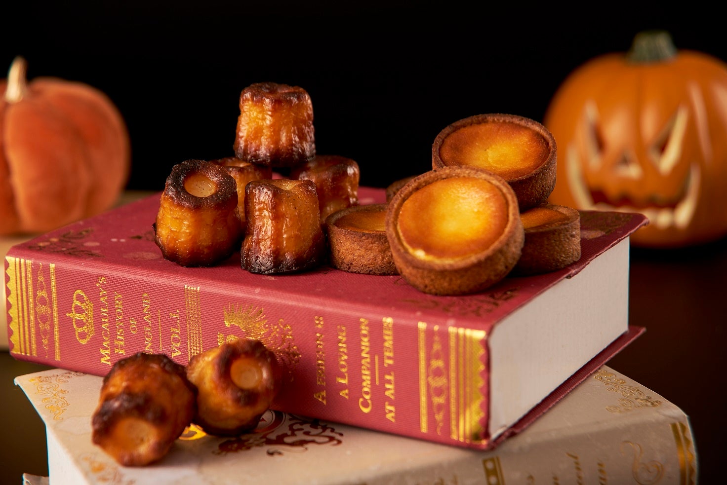 上段左:ハロウィーンスイートポテト 上段右:黒ゴマシュークリーム 下段左:ハロウィーングラススイーツ 下段右:カヌレ、サツマイモバスクチーズタルト