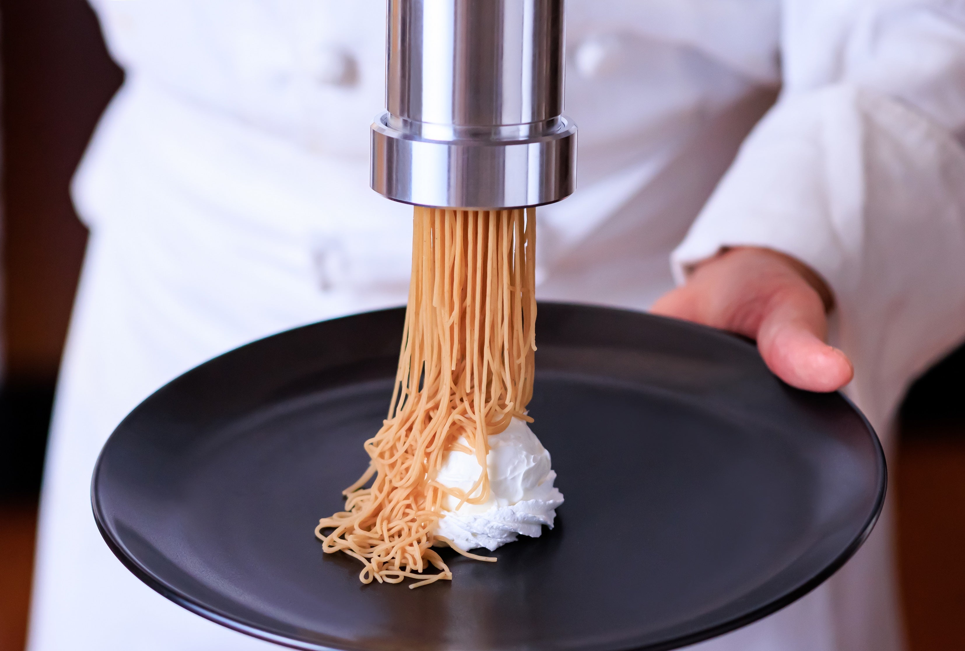 『スーパースイーツビュッフェ2023~いもくりなんきん~』の目玉スイーツとして、王道の“くり”とハロウィーン仕様の“かぼちゃ”の2種の特製ペーストを、お客さまの目の前で生絞りパフォーマンスを行う『生絞りモンブラン』が登場します。芳醇なミルクジェラートと濃厚マスカルポーネクリームのメレンゲの上から、パティシエ特製のまろやかで極細の生絞りペーストをたっぷりと。まるで絹糸のようなやわらかな食感と優しい甘さのハーモニーをご堪能ください。