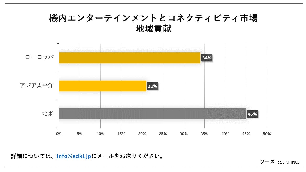 北米地域の市場が2035年末に最大のシェアを占めると予想されています。この地域には、世界最大の市場参入企業が多く存在し、この地域の成長を促進すると予想されます。Gogo LLC、Panasonic Avionics Corporation、Collins Aerospace などの主要な市場プレーヤーは、米国に拠点を置いています。ユナイテッド航空株式会社とデルタ航空株式会社など、地域の有名な航空会社の中には、Wi-Fiとタブレットを利用して乗客に補償資料を提供する取り組みを継続して行っているところもあります。さらに、BYODの普及により、航空会社は後部座席にスクリーンを設置する必要がなくなり、航空機全体の重量を軽減できる可能性があります。調査の結果、乗客の45%が機内エンターテイメントにデバイスを使用することを好み、シートバックのスクリーン下部を好むのは27%に過ぎないことが判明しました。