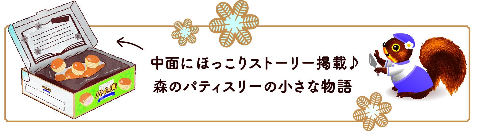 本商品のパッケージには、2人のリスのキャラクター「パイル」と「ロクシー」が登場。森の仲間たちによろこんでもらおうと、新しいパイの実づくりにチャレンジする、ほっこり心あたたまる一篇のミニストーリーが描かれています。さらに今回から初登場となる“森のパティスリー”が舞台に加わり、パイの実の森の物語がさらに広がります。デザインは2種類ご用意しており、そのうちのひとつには、パティスリーのオープンを楽しみに待つ“あるキャラクター”の姿も――。