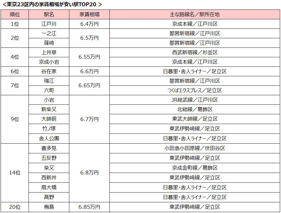 東京23区の家賃相場が安い駅ランキング 2024年版! 1位は「江戸川駅」 江戸川区、足立区、葛飾区の駅がTOP20内に多くランクイン