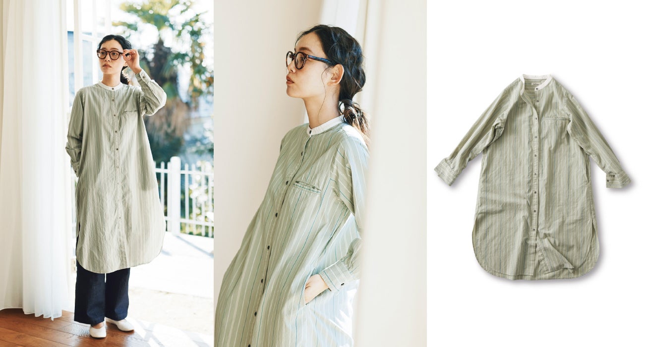 くすみのあるライトグリーンをベースにした、春らしいストライプのワンピースです。白生地を使ったクレリック衿がポイントになって、清涼感のある雰囲気を醸し出しています。ひざ丈なので、ジーンズなどのボトムスとレイヤードしたコーデも映えます。