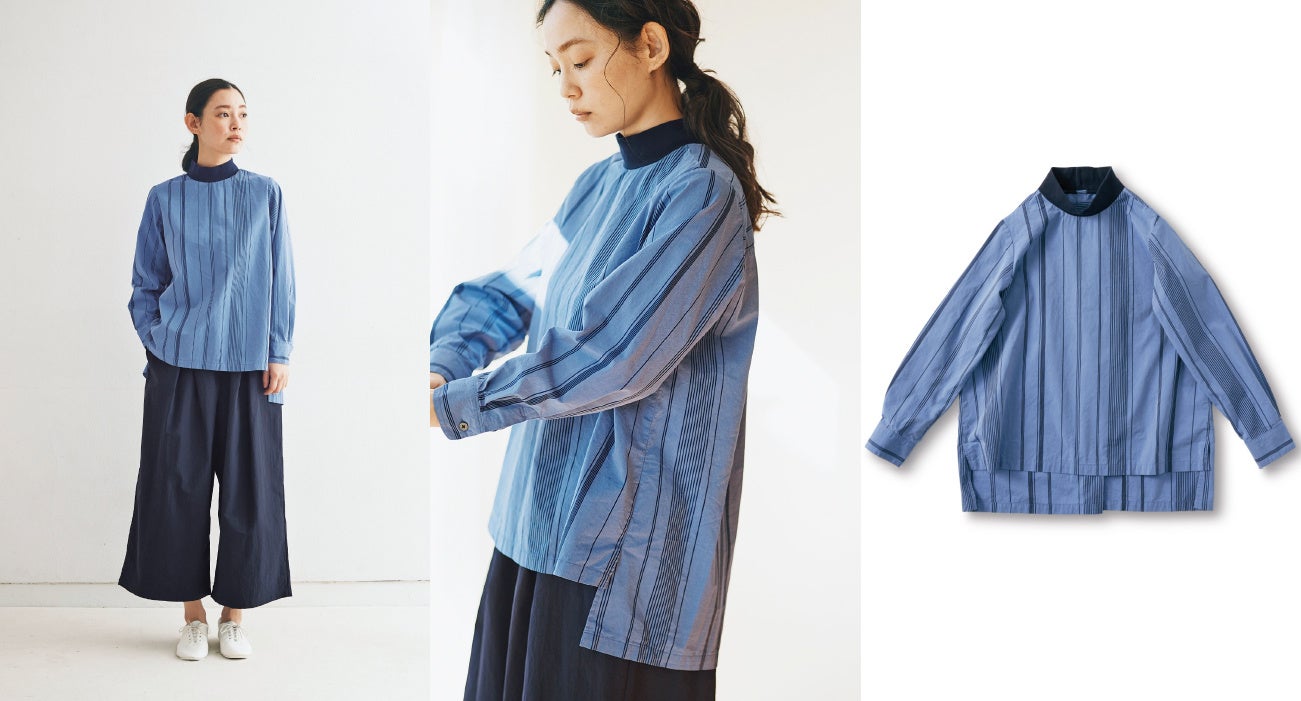 スパンフライスを使ったハイネック衿がポイントの、「青ストライプのハイネックトップス」です。カフス始末の袖や前後差のあるヘムラインなど、ブラウスのようなディテールとのバランスがポイントです。