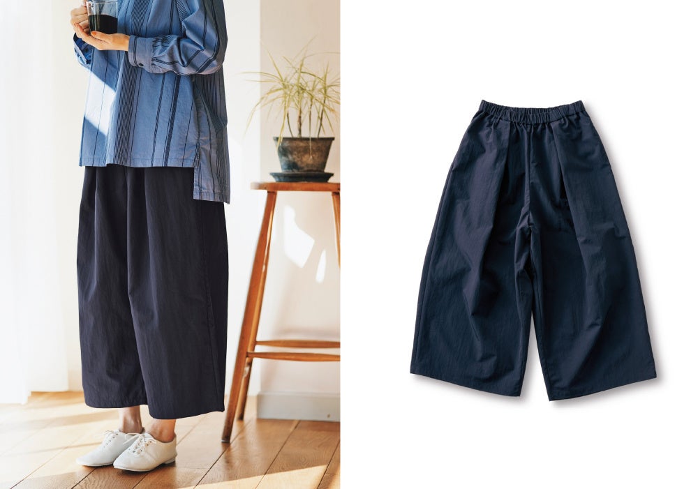 撥水加工をほどこした、ナイロン生地で仕立てたキュロットパンツです。小雨をしっかりとはじくため、憂うつな春の雨の日も、軽やかに過ごせます。