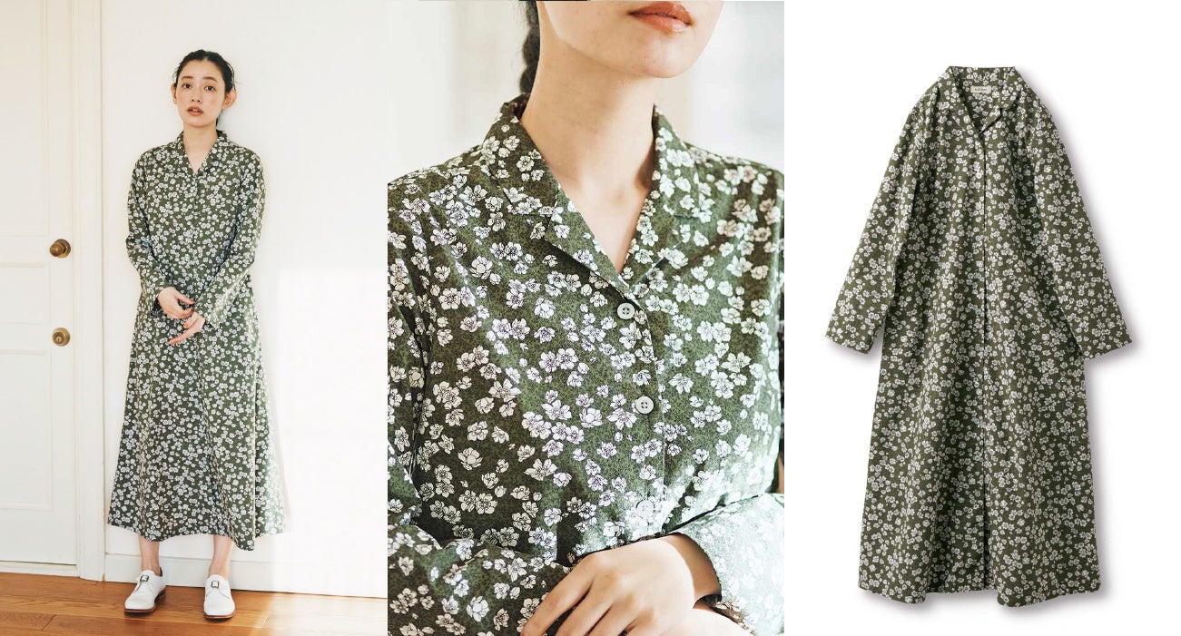 オープンカラーですっきりと仕上げたワンピースです。落ち着いたカーキグリーンがベースになっており、ガーリーな花柄でも大人っぽい雰囲気で着こなせます。