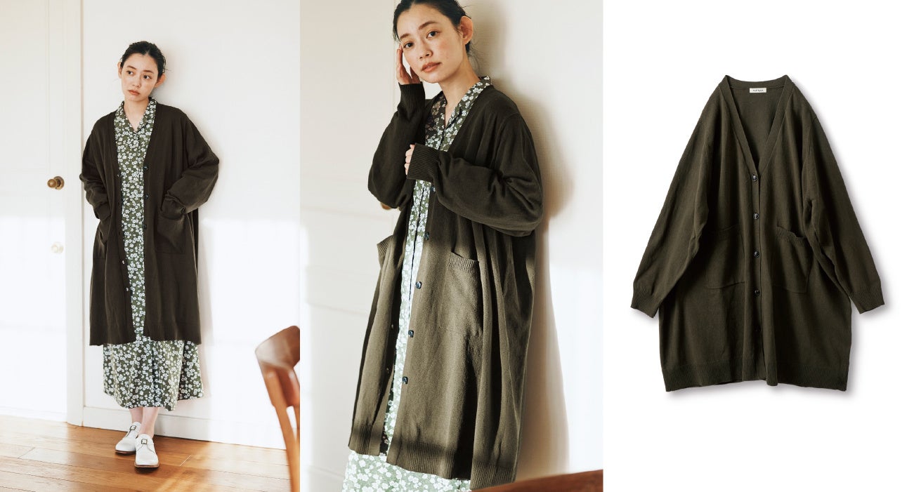 身幅とアームホールを広く取ったカーディガンで、オーバーサイズのトップスとも合わせておしゃれに着こなせます。前に付いた大きなパッチポケットが、ちょっとしたアクセントになっています。