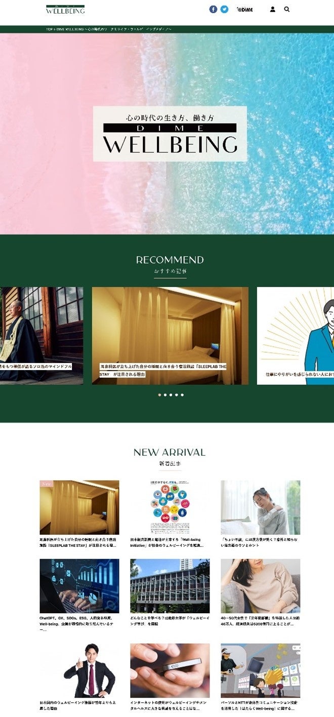 株式会社小学館が運営するビジネストレンドメディア『DIME』では、ビジネスパーソンに向けたウェルビーイングコンテンツを発信するバーティカルメディア「DIME WELL-BEING」をWEBマガジン「@DIME」(http://dime.jp/)にてローンチしました。今後、すでに発信している様々なビジネス分野のニュース発信とともに、強化してまいります。