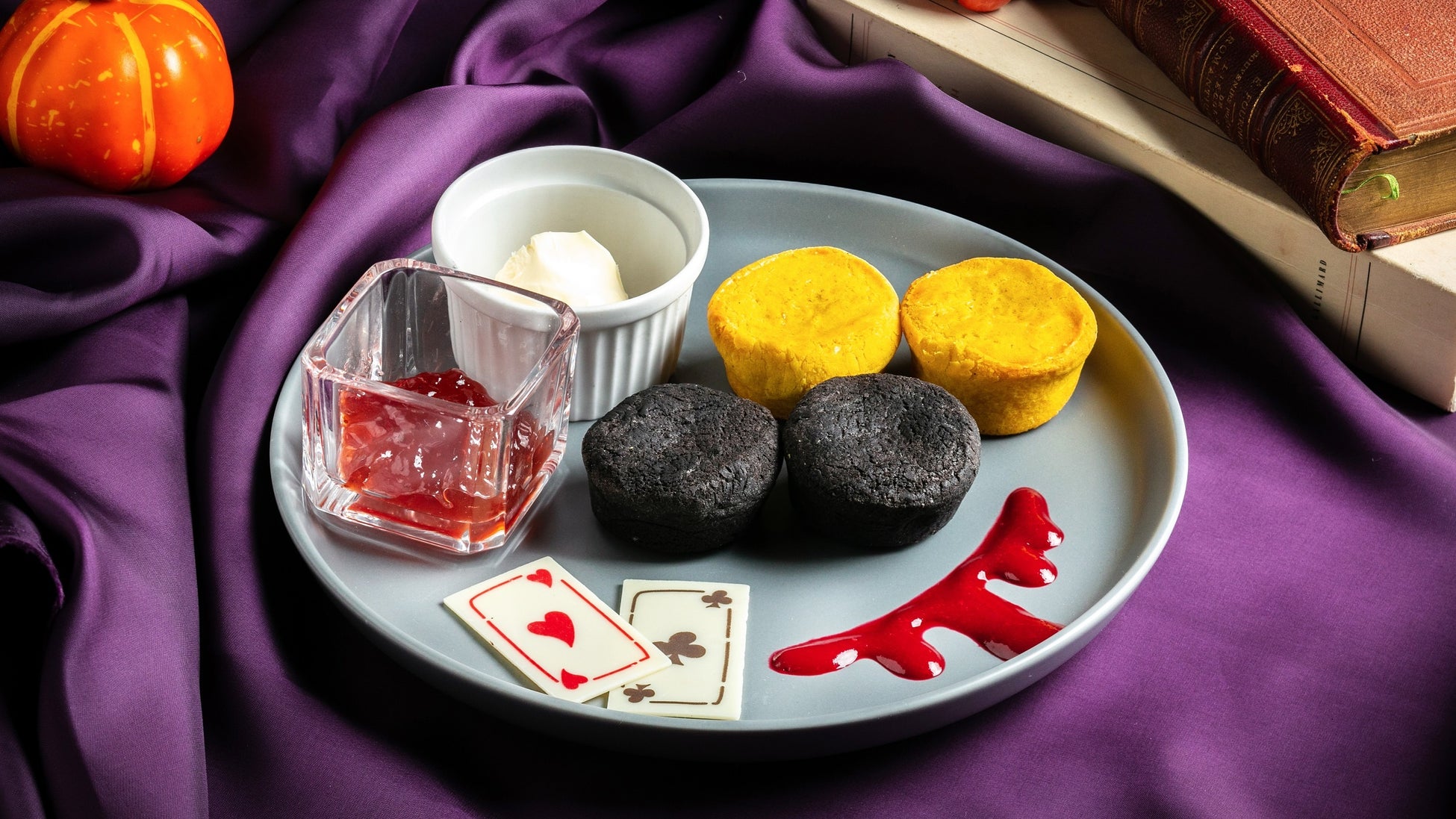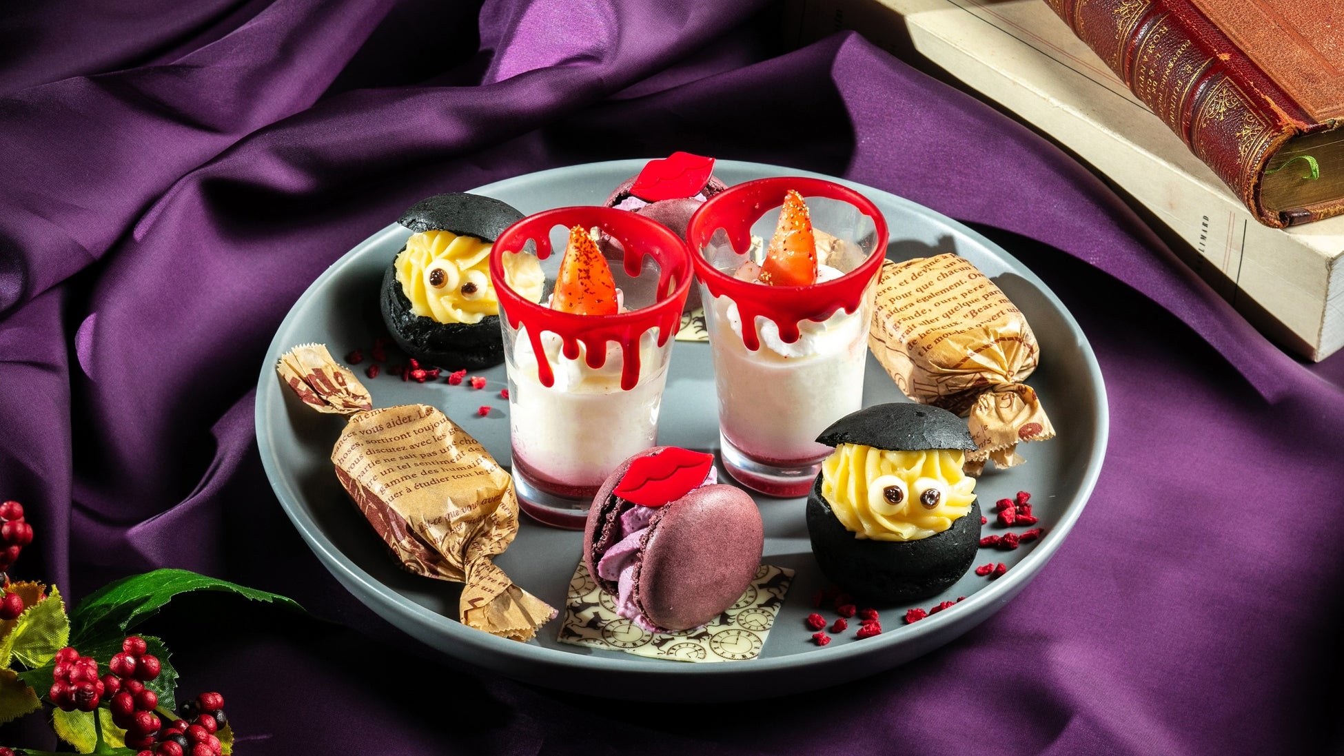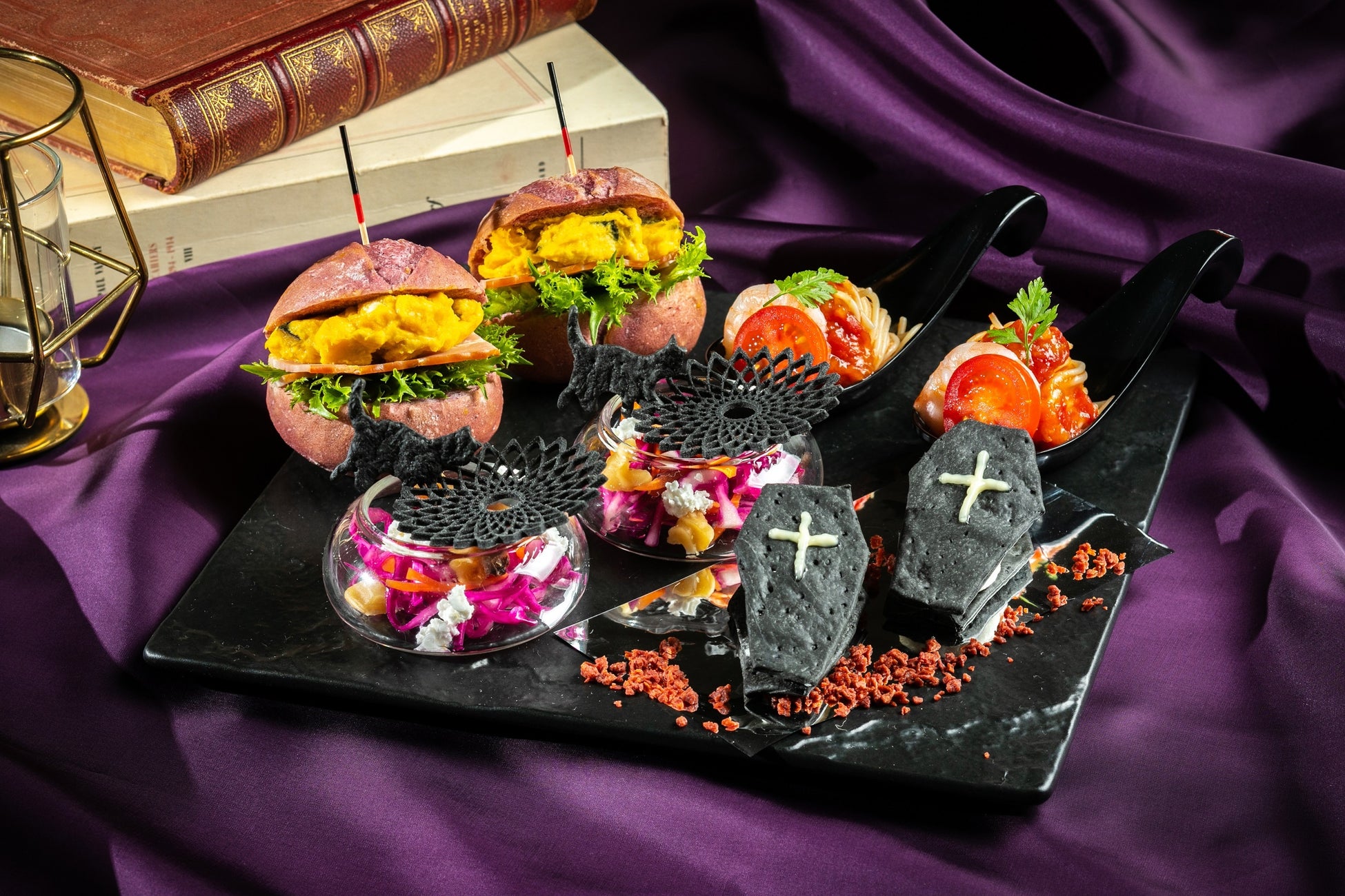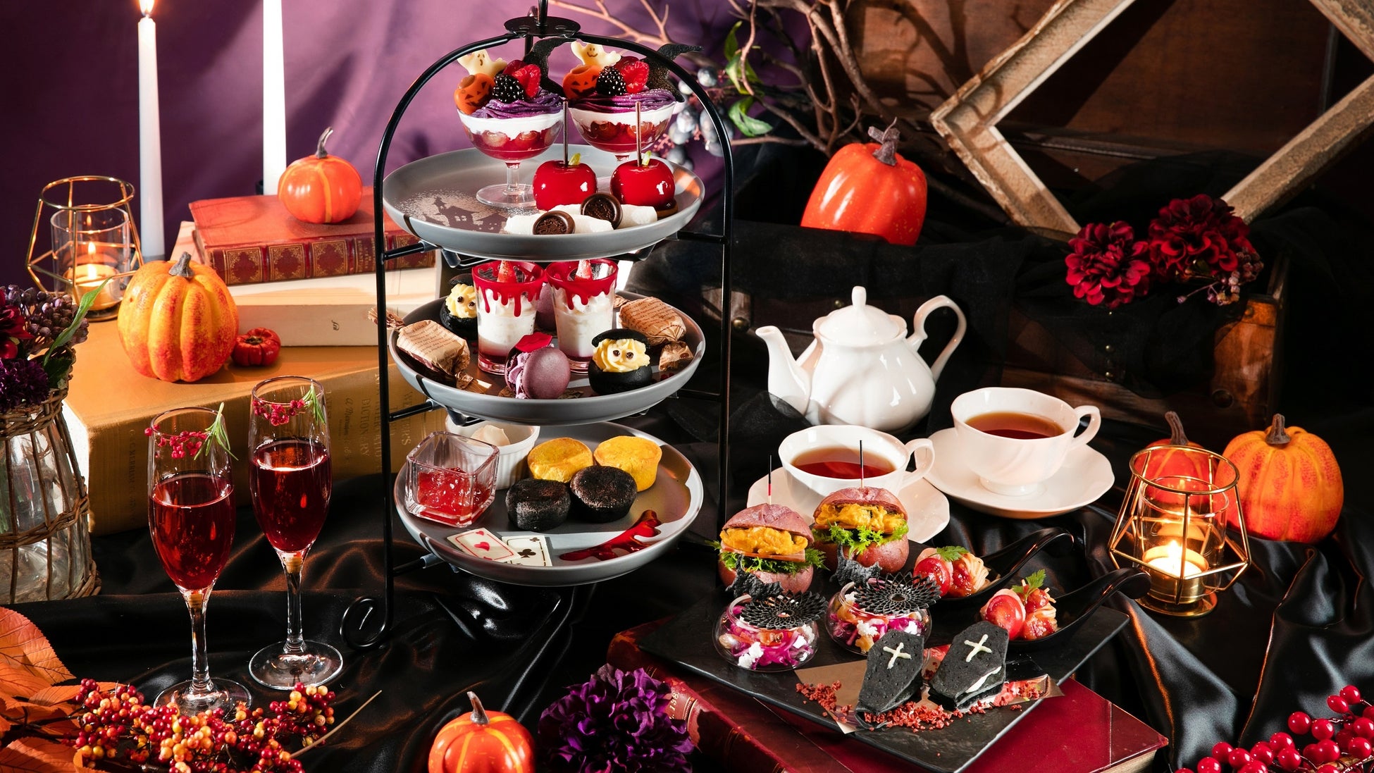スタンド中段は、ゴーストたちのダンスホールをイメージし、パンナコッタとラズベリーソースで仕上げた「血のキャンドルパンナコッタ」、竹炭生地とさつまいもクリームとカスタードのシュークリーム「ブラックゴーストシュー」や、ドライフルーツなどを混ぜ込んだハロウィーン定番菓子「バーンブラック」で今後の運勢を占いながらスイーツをお楽しみいただけます。
