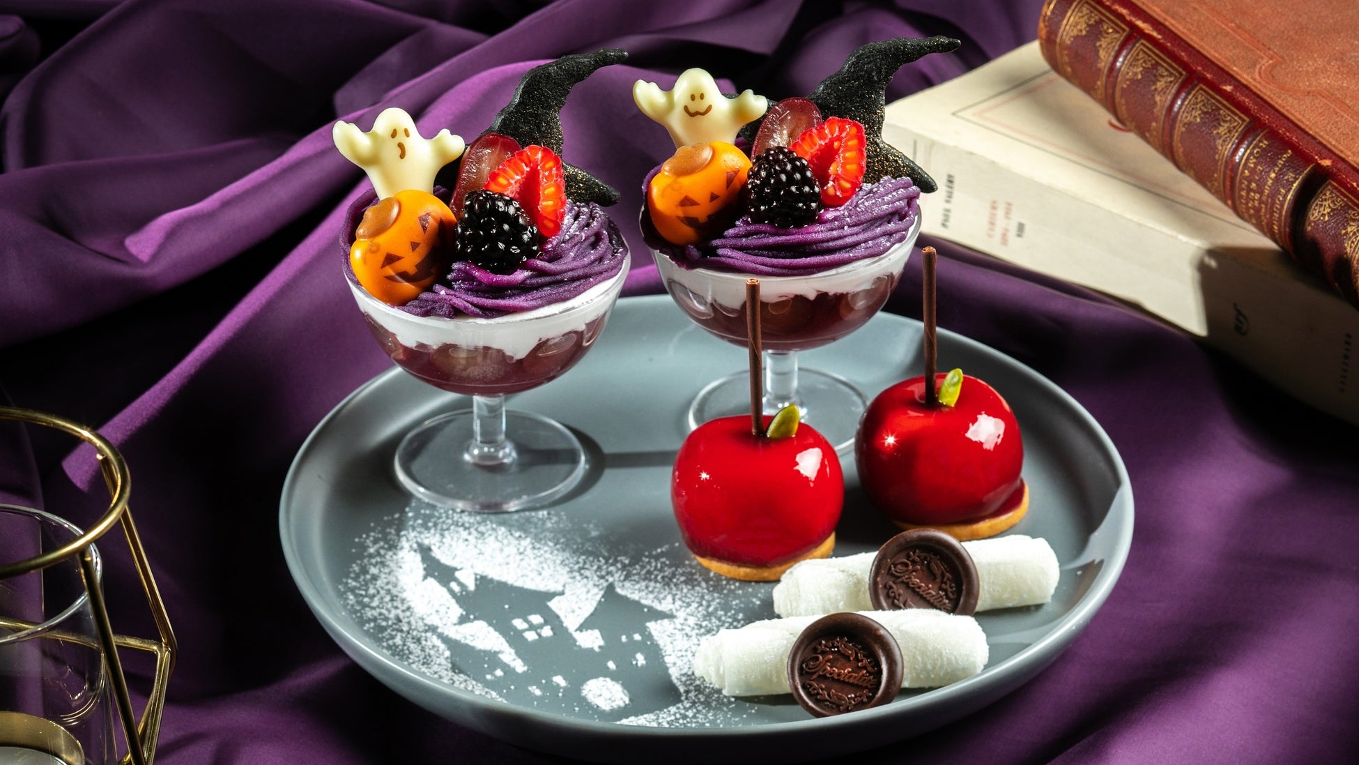 3段スタンド上段は、舞踏会への入口をイメージし、ぶどう入りカシスジュレの上に、生クリーム、紫芋のモンブランを重ねた、ゴーストが飛び交う「ハロウィーンパフェ」や、招待状に見立てた求肥とチョコのシーリングスタンプで封をした「あま~い招待状」を手に、中段のダンスホールへと進みます。