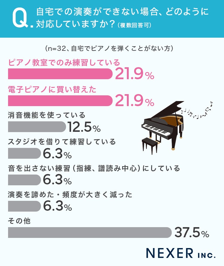 最も多かったのは「ピアノ教室でのみ練習している」と「電子ピアノに買い替えた」がともに21.9%でした。