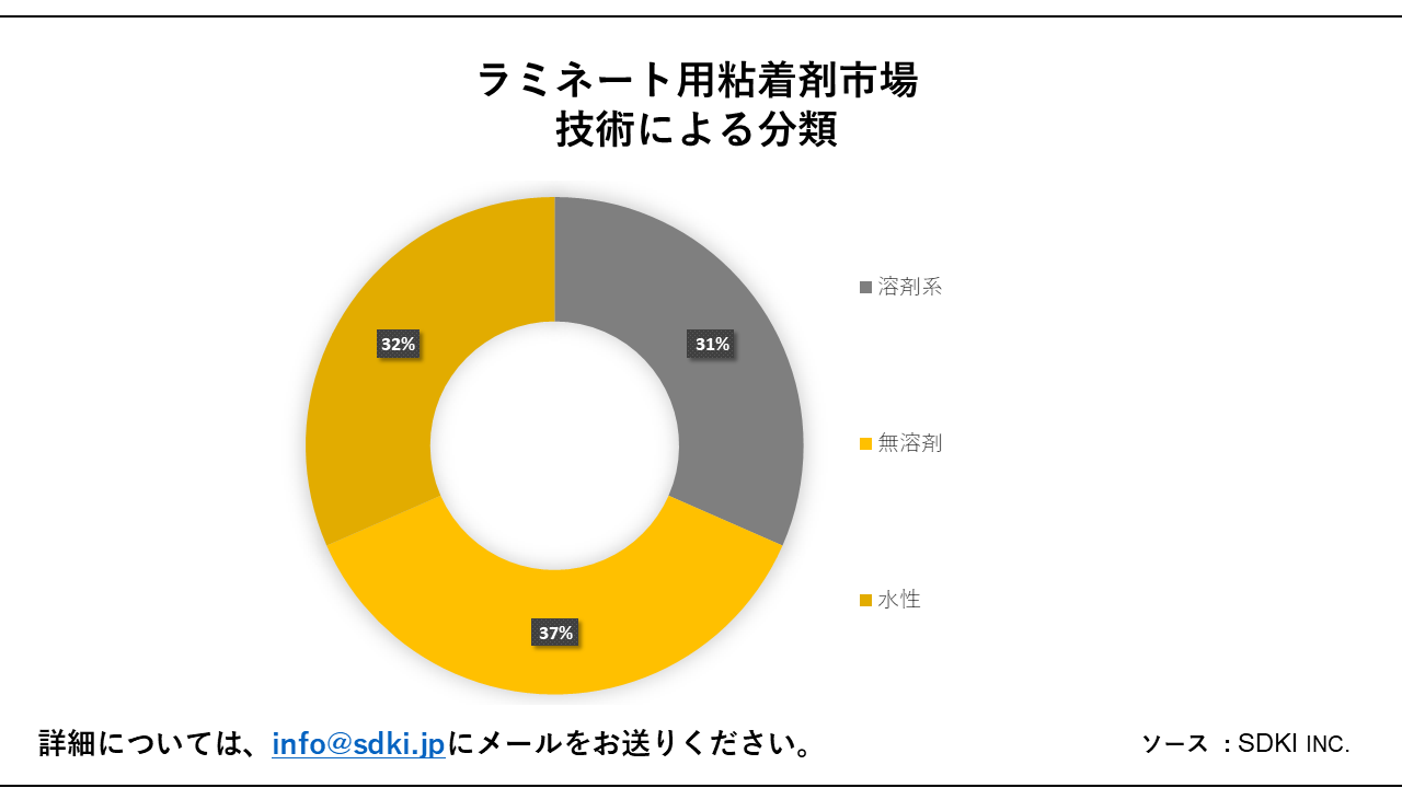環境問題と持続可能性への関心の高まりから、溶剤系技術よりも水系技術を選択するメーカーが増加しており、水系ラミネート用粘着剤は今後数年間で市場シェアを拡大すると予想されます。また、水性接着剤はさまざまな基材に塗布できることも重要なメリットです。さらに、政府が農業食品部門に力を入れていることと、建設、電子機器、包装などの産業が大きく成長していることも、水性ラミネート用粘着剤の使用を増加させています。