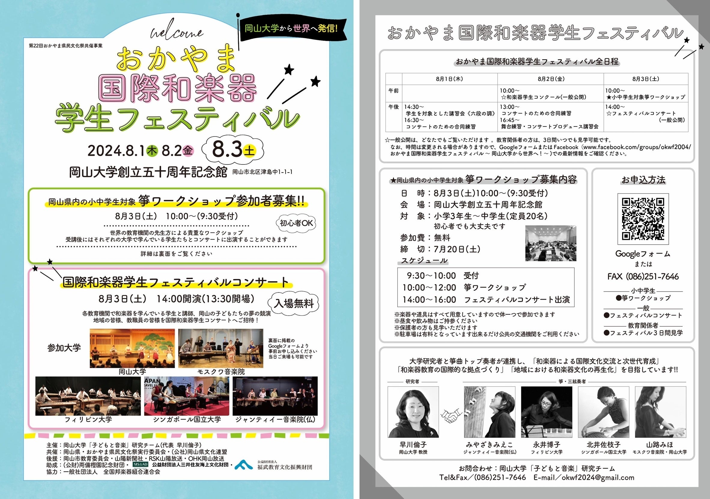 国立大学法人岡山大学(本部:岡山市北区、学長:那須保友)学術研究院教育学域の「子どもと音楽」研究チームは、2024年8月1日から3日間に渡り、世界で和楽器を学ぶ学生と指導者を本学へ招聘し、本学の学生および岡山県の子どもとたちと和楽器「箏」を通した国際交流を行う「おかやま国際和楽器学生フェスティバル」を本学津島キャンパスの創立五十周年記念館で開催しました。