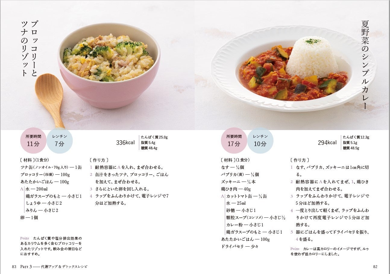 例えば、写真の「ブロッコリーとツナのリゾット」は、ツナ缶でたんぱく質を加え、デトックスによいブロッコリーを加えてバランスよく。でも具材を混ぜ合わせてレンジに入れるだけなので、手間がかかりません。「カロリーを気にせず食べられてうれしい」「罪悪感がない!」と評判を呼んだのもうなずけます。