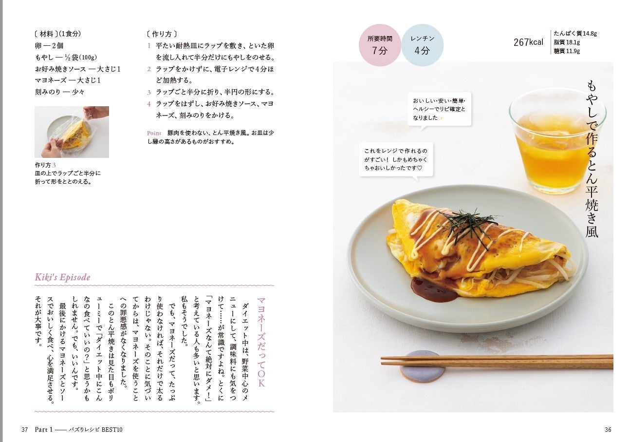 例えば、写真の「とん平焼き風」もレンチンのみ! 平皿1枚で作れて、そのまま食べられ、所要時間は10分以下。ソースやマヨネーズがかかった見た目もおいしそう、ボリュームもたっぷり。なのに総エネルギーは267kcal。SNSでも「これなら失敗なし」「画期的」と大人気のバズレシピです。