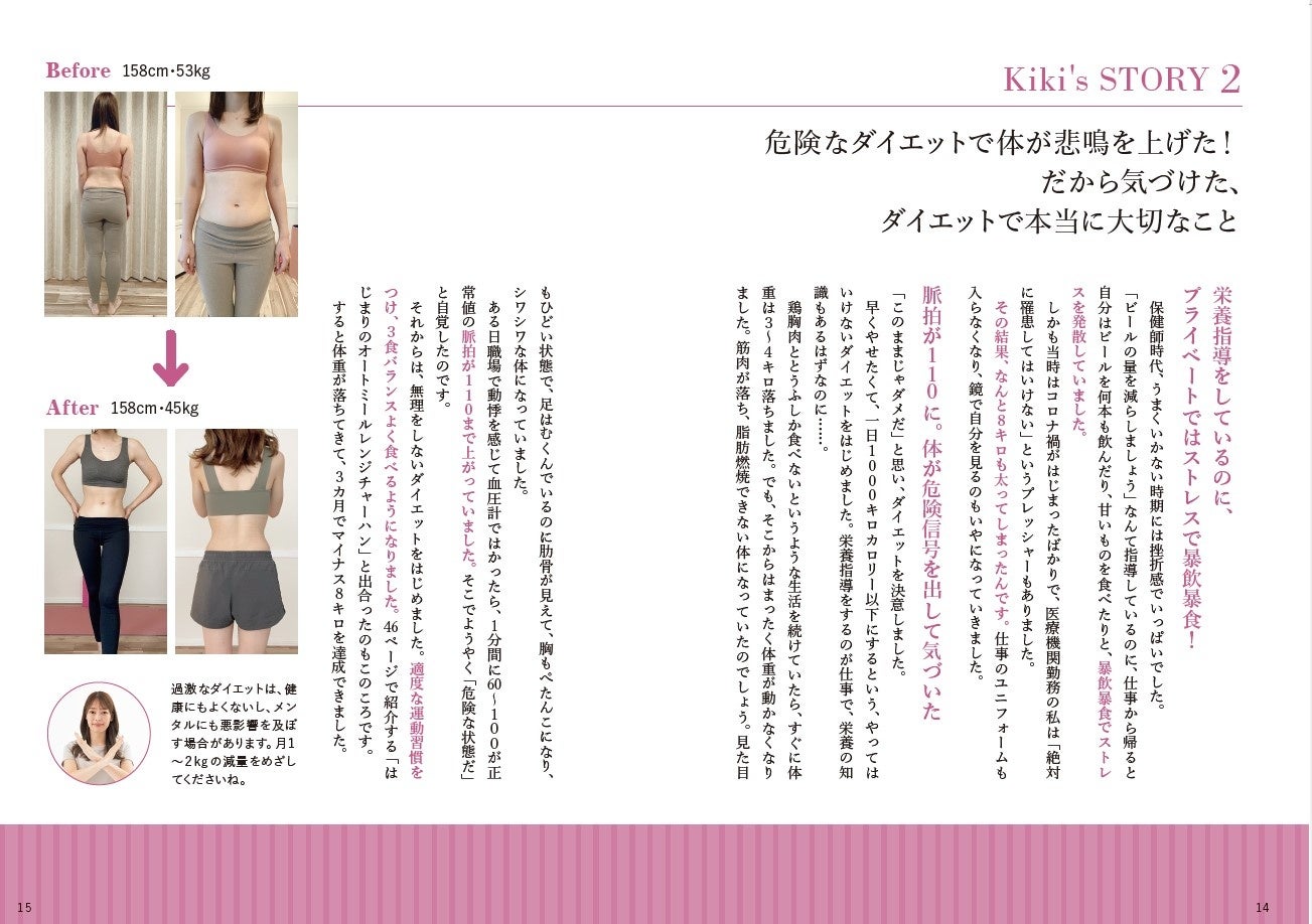 このレシピを多くの人に伝えたいと、SNSで発信を始めたところ、「Kikiさんみたいな美ボディなりたい!」「きれいな美脚!」「かわいい!」と、どんどんフォロワーが増え、現在はインスタグラムのフォロワー数20万人をはじめ、SNS総フォロワー数は40万人(2024年7月現在)になり、「レシピ本ほしい」という熱い声にこたえて本書が発売となったのです。