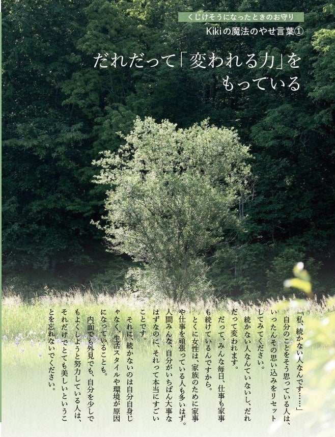 さらにさらに「ダイエット・モチベーター」を自称するKikiさんが、くじけそうになる人たちに向けて、モチベーションアップさせる「魔法のやせ言葉」も紹介。Kikiさんがやさしく寄り添ってくれるメソッドは、本書で詳しく紹介しています。さあ今日から始めてみましょう。