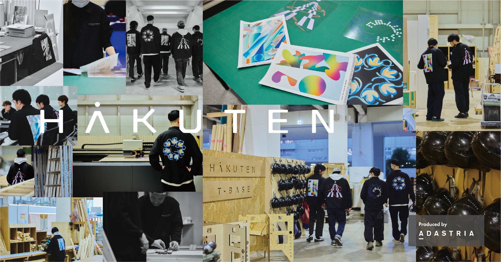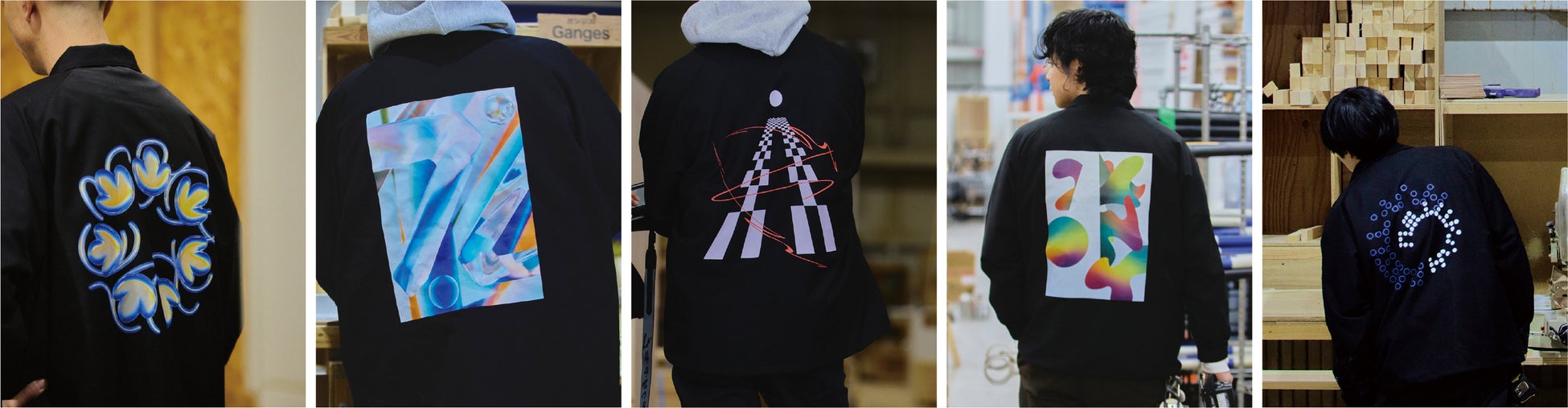 博展よりデザイン・スタジオのYAR(ヤール)が手掛けたオリジナルアートワーク(5種)を提供いただき、バックプリントに使用しました。全てのアートワークが、社名の”HAKUTEN”を表していて、プリントの手法にもこだわった仕上がりになっています。