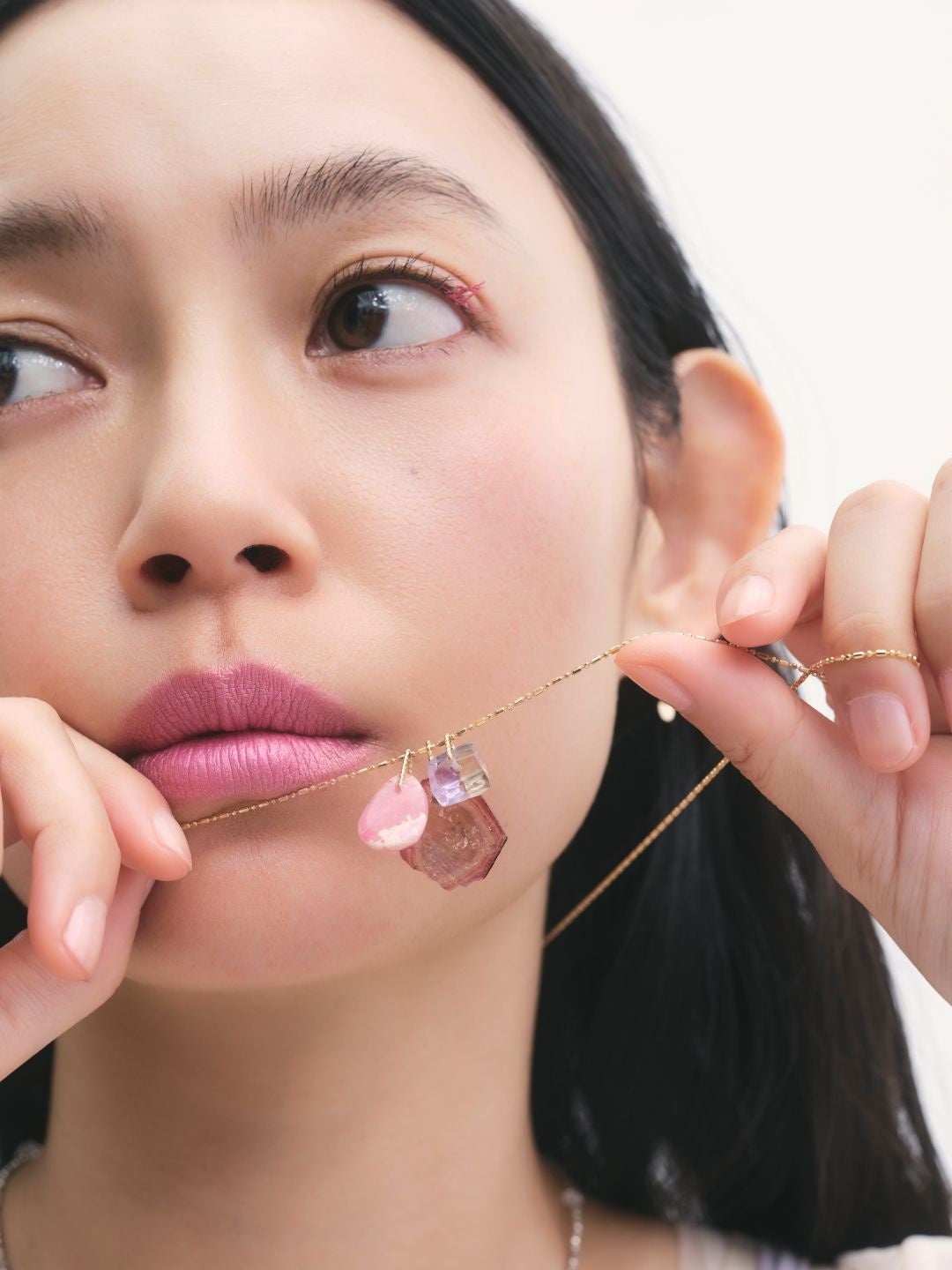 トレンドカラーのダスティーピンクを軸に、色と質感で遊ぶ青みピンクメイク。頬には天然石のような透明感を意識し、血色と艶をほんのりとプラス。アクセントとなる目元とリップはあえてマットに仕上げた後、90’sムードを感じさせるメタリックリップを重ねて、印象的な表情に。ピュアな印象を持つ天然石のイメージをベースにしながら、すべてをナチュラルに寄せすぎず、ポイントで強さを加えることで洗練された洒落感を演出。まつ毛は目尻にのみカラーマスカラを取り入れ、視線の動きに合わせて思わず目を引くニュアンスを添えています。