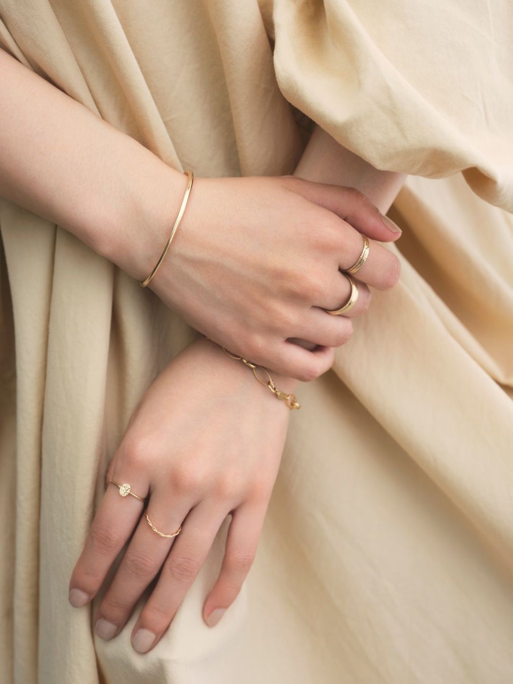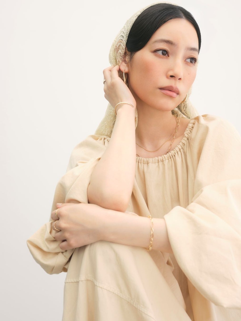 顔全体の立体感を引き立てるコントゥアリングメイク。春夏に映える、日焼けした肌の内側からにじむような、さらりとしたドライな質感を演出します。日差しを浴びたときに自然に色づく頬の高い位置と鼻筋にゴールドベージュをオン。唇はあえて艶をプラスすることでコントラストを生み、抜け感のある表情に仕上げています。リップの輝きがゴールドジュエリーとリンクするよう、全体のスタイリングを構成しています。